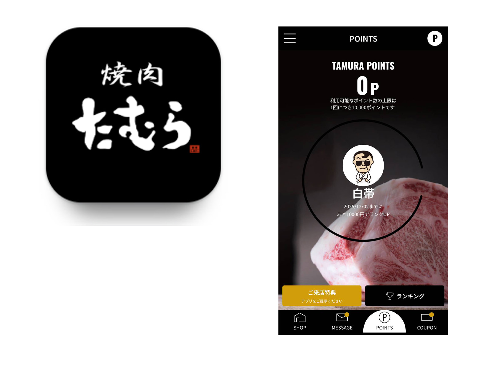 ご自身のスマホで「焼肉たむら」アプリをご提示ください。